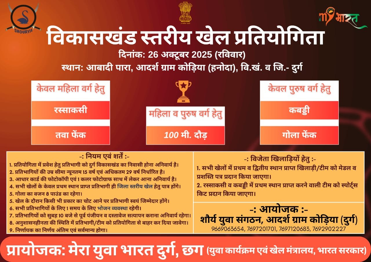 दुर्ग। मेरा युवा भारत दुर्ग, छग युवा कार्यक्रम एवं खेल मंत्रालय, भारत सरकार के निर्देशन में आदर्श ग्राम कोड़िया (हनोदा) विकासखंड व जिला दुर्ग में 26 अक्टूबर 2025 दिन रविवार को विकासखंड स्तरीय खेल प्रतियोगिता का आयोजन किया गया है जिसमें दुर्ग विकासखंड के अंतर्गत सभी ग्राम के 15 से 29 वर्ष के युवा प्रतिभागी/टीम को आमंत्रित किया गया है।