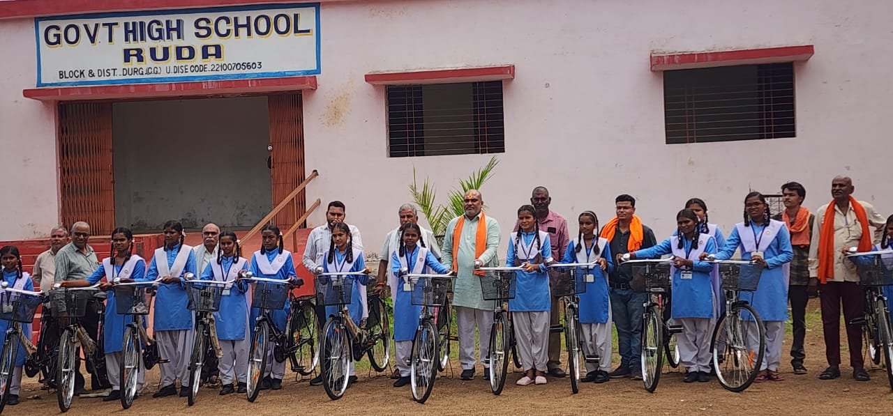 दुर्ग। दुर्ग ग्रामीण विधायक ललित चंद्राकर ने रुदा (खाड़ा) में शासकीय हाई स्कूल रूदा की छात्राओं को सरस्वती सायकिल योजना के तहत सायकिल का वितरण किया। छात्राओं ने सायकिल की घंटी बजाकर विधायक ललित चंद्राकर का अभिवादन किया। छात्राओं को तिलक लगाकर मिठाई खिलाया और साइकिल वितरण किया।