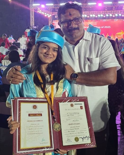 दुर्ग। उड़ीसा के कटक शहर में स्थित श्री श्री रविशंकर यूनिवर्सिटी का दीक्षांत समारोह विगत दोनों पूज्य गुरुदेव श्री श्री रविशंकर जी के सानिध्य में संपन्न हुआ। जिसमें आर्किटेक्चर डिपार्टमेंट के इंटीरियर डिजाइन कोर्स में छत्तीसगढ़ के दुर्ग शहर के ग्राम कोलिहापुरी की कु. विश्वेशा हरमुख ने स्वर्ण पदक हासिल कर सम्पूर्ण छत्तीसगढ़ का मान बढ़ाया। साथ ही रजत पदक भी छत्तीसगढ़ के अम्बिकापुर से कु.श्रेया मित्तल ने हासिल किया। वही कांस्य पदक भुवनेश्वर की सुनयना पुजारी ने प्राप्त किया।