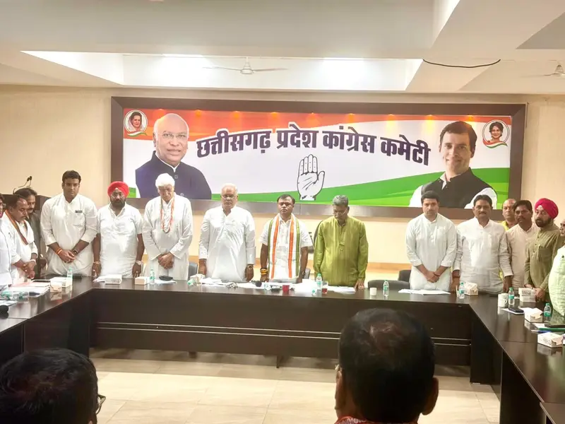 रायपुर। प्रदेश कांग्रेस कार्यालय राजीव भवन में बुधवार को जिलाध्यक्षों और बूथ कमेटी के जिला प्रभारियों की बैठक संपन्न हुई। बैठक में दो प्रस्ताव भी पारित किए गए। पहले निंदा प्रस्ताव और दूसरा शोक प्रस्ताव। यह बैठक प्रदेश कांग्रेस अध्यक्ष दीपक बैज की अध्यक्षता और नेता प्रतिपक्ष डॉ. चरणदास महंत, पूर्व मुख्यमंत्री भूपेश बघेल, पूर्व उपमुख्यमंत्री टी.एस. सिंहदेव, पूर्व मंत्री ताम्रध्वज साहू, पूर्व मंत्री रविन्द्र चौबे, प्रभारी महामंत्री मलकीत सिंह गैदू की उपस्थिति में राजीव भवन में संपन्न हुई।