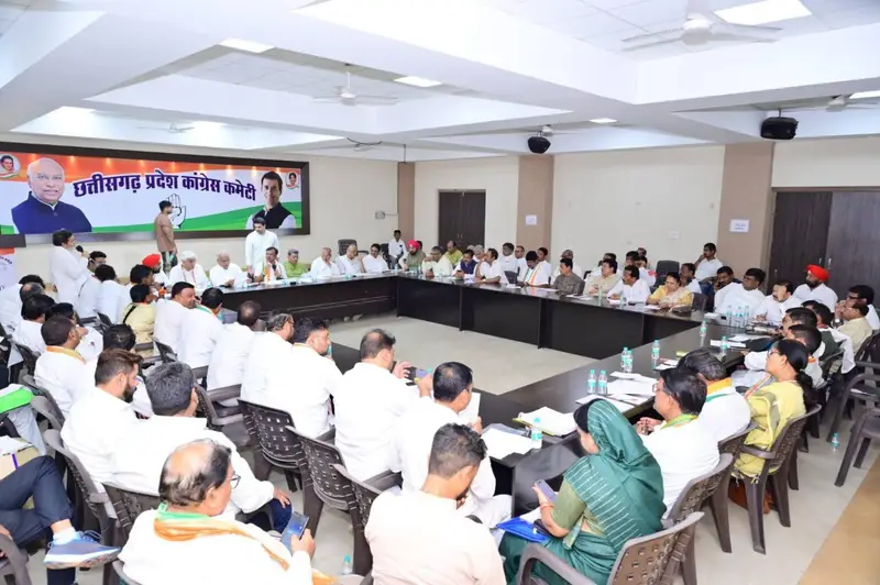रायपुर। प्रदेश कांग्रेस कार्यालय राजीव भवन में बुधवार को जिलाध्यक्षों और बूथ कमेटी के जिला प्रभारियों की बैठक संपन्न हुई। बैठक में दो प्रस्ताव भी पारित किए गए। पहले निंदा प्रस्ताव और दूसरा शोक प्रस्ताव। यह बैठक प्रदेश कांग्रेस अध्यक्ष दीपक बैज की अध्यक्षता और नेता प्रतिपक्ष डॉ. चरणदास महंत, पूर्व मुख्यमंत्री भूपेश बघेल, पूर्व उपमुख्यमंत्री टी.एस. सिंहदेव, पूर्व मंत्री ताम्रध्वज साहू, पूर्व मंत्री रविन्द्र चौबे, प्रभारी महामंत्री मलकीत सिंह गैदू की उपस्थिति में राजीव भवन में संपन्न हुई।