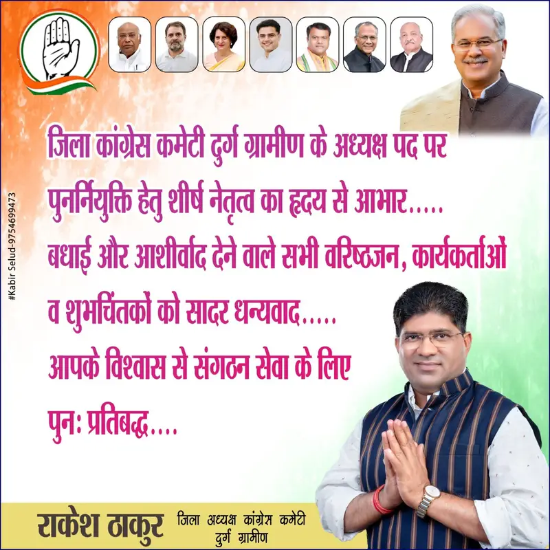 राकेश ठाकुर ने बधाई एवं आशीर्वाद देने वाले सभी वरिष्ठ नेताओं, पदाधिकारियों, कार्यकर्ताओं, सहयोगियों और शुभचिंतकों का विशेष धन्यवाद व्यक्त किया। उन्होंने कहा कि आप सभी का समर्थन, स्नेह और आशीर्वाद ही मेरी कार्यशक्ति है। मैं संगठन की अपेक्षाओं पर खरा उतरने और दुर्ग ग्रामीण कांग्रेस को और अधिक मजबूत बनाने का संकल्प दोहराता हूँ। उन्होंने आगे कहा कि आने वाले समय में संगठन को नई ऊर्जा, नई दिशा और नई गति देने के लिए सभी कार्यकर्ताओं के साथ मिलकर एक समन्वित और सक्रिय कार्ययोजना पर काम किया जाएगा।