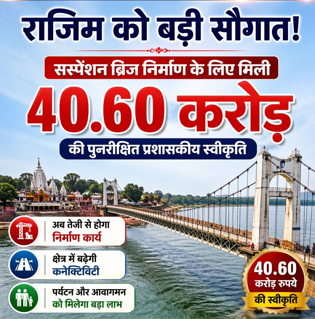 राजिम में सस्पेंशन ब्रिज निर्माण के लिए मिली 40.60 करोड़ की पुनरीक्षित प्रशासकीय स्वीकृति