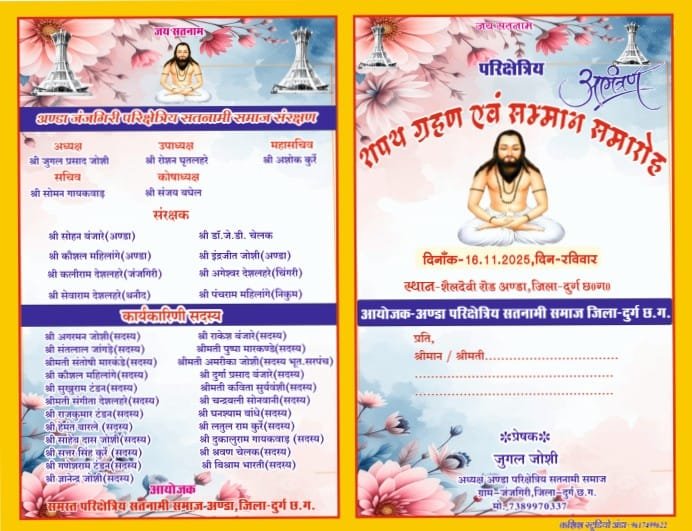 दुर्ग। दुर्ग ग्रामीण विधानसभा क्षेत्र के ग्राम अंडा में सतनामी समाज के द्वारा अंडा परिक्षेत्रीय एवं ग्रामीण अध्यक्ष के तत्वावधान में नवनियुक्त पदाधिकारियों का शपथ ग्रहण एवं सम्मान समारोह का आयोजन 16 नवम्बर दिन रविवार को दोपहर 12 बजे से किया गया है। कार्यक्रम के मुख्य अतिथि जिला पंचायत अध्यक्ष श्रीमती सरस्वती बंजारे होंगी। विशेष अतिथी पंथी कलाकार पुराणिक लाल चेलक, सतनाम समाज जिला मोहला मानपुर के अध्यक्ष बलराम चेलक, खैरागढ़ जिला अध्यक्ष खुमान देशलहरे, बालोद जिला अध्यक्ष संजय बारले, राजनांदगांव जिला अध्यक्ष युवराज डिड़हरे, धमतरी जिला अध्यक्ष भावसिंह डाहरे, गुंडरदेही तहसील अध्यक्ष नीलकंठ टंडन, पाटन तहसील अध्यक्ष संतराम कुर्रे, सतनामी कल्याण एवं जागरण समिति दुर्ग के अध्यक्ष श्रीमती ईश्वरी गायकवाड़, उपाध्यक्ष श्रीमती लेनकला वेद, सतनामी आश्रम दुर्ग के उपाध्यक्ष श्रीमती अम्बिका मारकंडे, धमतरी युवा प्रमुख कोमल सम्हलकर, समाजसेवी ऋषि टंडन, पूर्व जनपद सभापति हरेन्द्र घृतलहरे, उपसरपंच यशवंत बंजारे, दुर्ग तहसील के पूर्व अध्यक्ष एवं जिला महंत दिनेश देशलहरे होंगे। उक्त कार्यक्रम में स्थानीय ग्रामीण सतनामी समाज के अध्यक्ष, भंडारी, शाटीदार एवं ग्रामीणजन उपस्थित रहेंगे। जिसमें सतनाम भजन बरबसपुर महासमुंद वाले का भजन कार्यक्रम रखा गया है। अंडा परिक्षेत्र के अध्यक्ष युगल जोशी ने कार्यक्रम में अधिक से अधिक संख्या में सामाजिक लोगो की उपस्थिति की अपील की है।