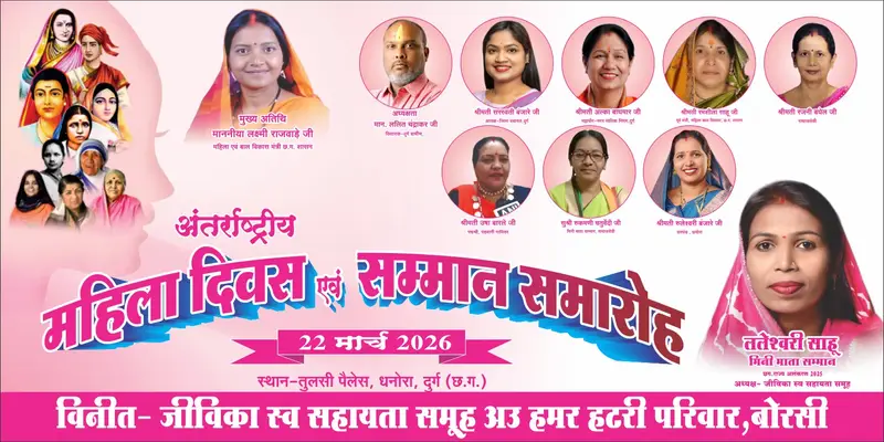 दुर्ग। जीविका स्व सहायता समूह बोरसी एवं हमर हटरी परिवार बोरसी के तत्वावधान में अंतर्राष्ट्रीय महिला दिवस के अवसर पर भव्य सम्मान समारोह का आयोजन दिनांक 22 मार्च 2026, रविवार को तुलसी पैलेस धनोरा (दुर्ग) में किया गया है।